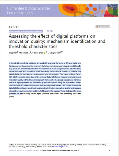 近日,日韩人妻无码一区二区三区久久99_日韩精品一区二区三区中文在线_无码日韩精品一区二区免费_久久久91精品国产一区二区三区_亚洲精品久久久一区黄无码_国产91精品一区二区麻豆网站_成人国内精品久久久久影院文法学院讲师韩冰在《Humanities & Social science communications》发表题为“Assessing the effect of digital platforms on innovation quality: mechanism identification and threshold characteristics”的文章。